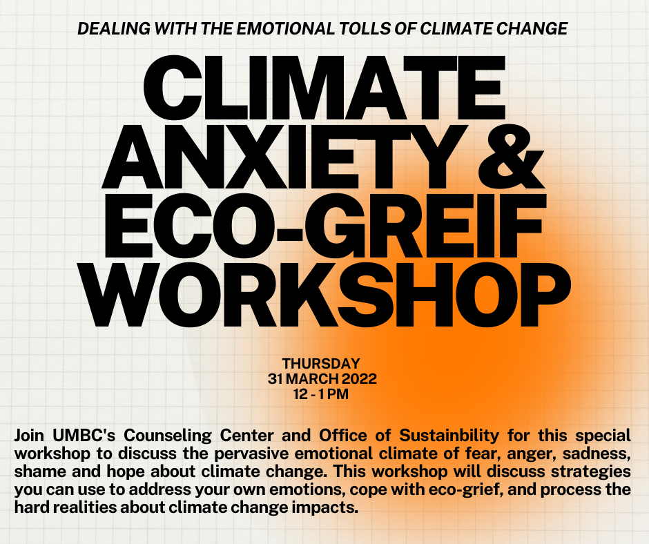 UMBC’s Counseling Center and Office of Sustainability invite you to join our special workshop to discuss the pervasive emotional climate of fear, anger, sadness, shame and hope about climate change. This workshop will discuss strategies you can use to address your own emotions, cope with eco-grief, and process the hard realities about climate change impacts.